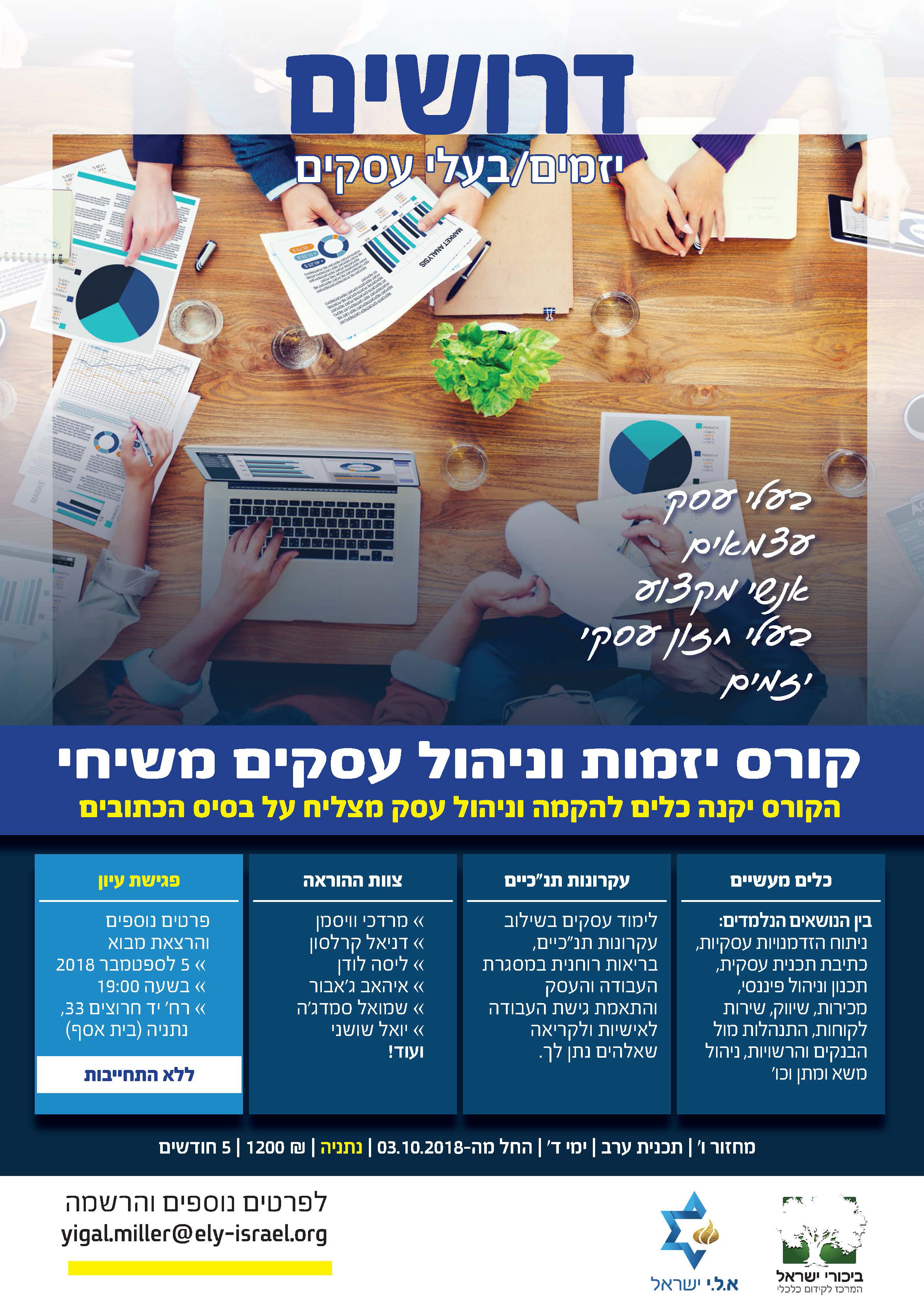 ELY Ltd and Israel Firstfruits Center for Economic Advancement are pleased to announce the sixth Kingdom business and entrepreneurship course . The course will be conducted every Wednesday evening for half a year, starting October 3. It will be held at Beit Asaf Congregation in Natania. The course provides a biblical foundation and practical tools for managing a business and serving in the marketplace. The course will include intensive coaching as part of our new business incubator. The course will be conducted in Hebrew. Please take a moment to watch this short video: http://youtu.be/POv1dkuQeuc A short introductory meeting will be held for those interested at Beit Asaf on Wednesday, September 5th at 19:00. Entrance interviews will be held September 13th and 17th (Location will be published later). The course will cost 1200 NIS which covers a light dinner and business coaching. For more information and to register please write [email protected] , or call 02-6516955 Course location: Yad Haruzim 33, Netanya (Beit Asaf congregation) Google maps link: https://goo.gl/maps/K68ke6SbY4M2 Waze link: https://www.waze.com/livemap?lat=32.28344833900652&lng=34.86552214635595&zoom=17